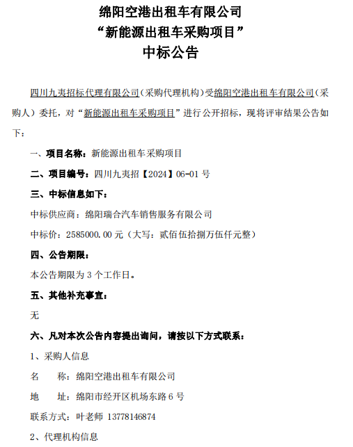 綿陽空港出租車有限公司 “新能源出租車采購(gòu)項(xiàng)目” 中標(biāo)公告