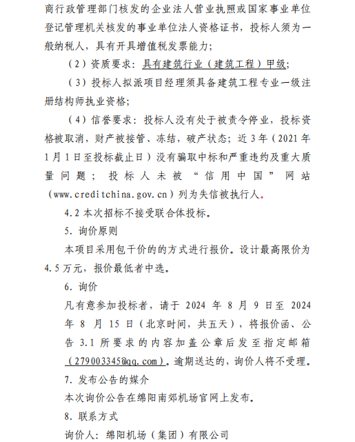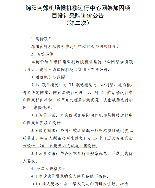 綿陽南郊機場候機樓運行中心網(wǎng)架加固項目設(shè)計采購詢價公告(第二次)