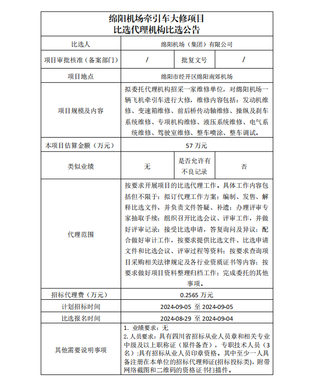 綿陽(yáng)機(jī)場(chǎng)牽引車大修項(xiàng)目比選代理機(jī)構(gòu)比選公告